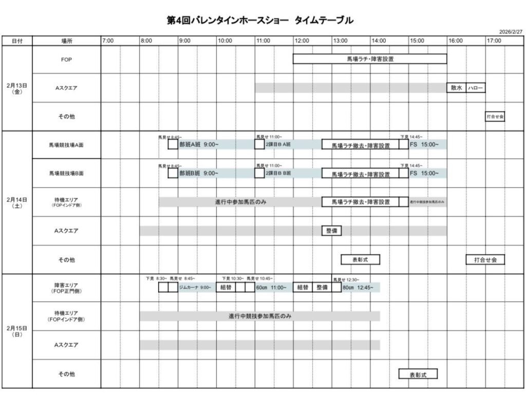 2/13(金)から2/15(日)にかけてJRA馬事公苑にて開催されております第4回バレンタインホースショーの2/14(土)の出番時間が決まりましたので、お知らせいたします。