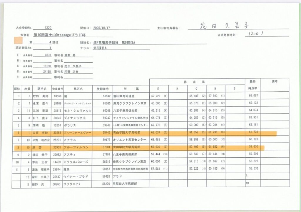 10/17(金)から10/19(日)にかけて御殿場市馬術・スポーツセンターにて開催されます第10回富士山Dressageプラド杯の結果及び出番時間をお知らせいたします。